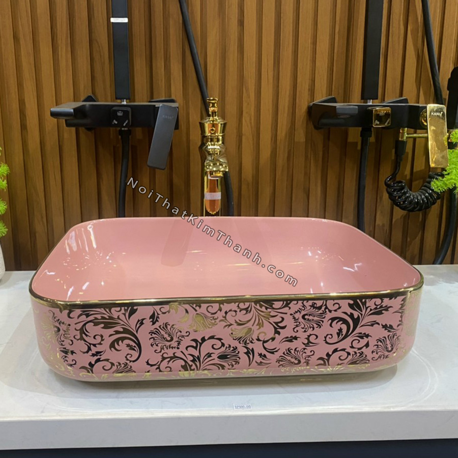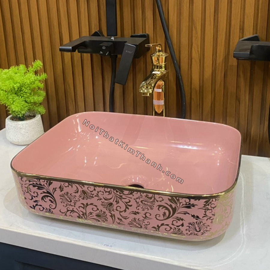 Lavabo đặt bàn màu hồng có hoa văn - LB95